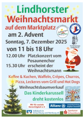 Ein stimmungsvoller Nachmittag für Groß & Klein: Am 2. Advent (Sonntag, der 07. Dezember 2025) verwandelt sich der Marktplatz in Lindhorst (vor dem Il Porto) ab 11 Uhr in einen kleinen Weihnachtsmarkt – mit Musik, Posaunenchor, Leckereien in Süß und Deftig, Winzerglühwein etc.